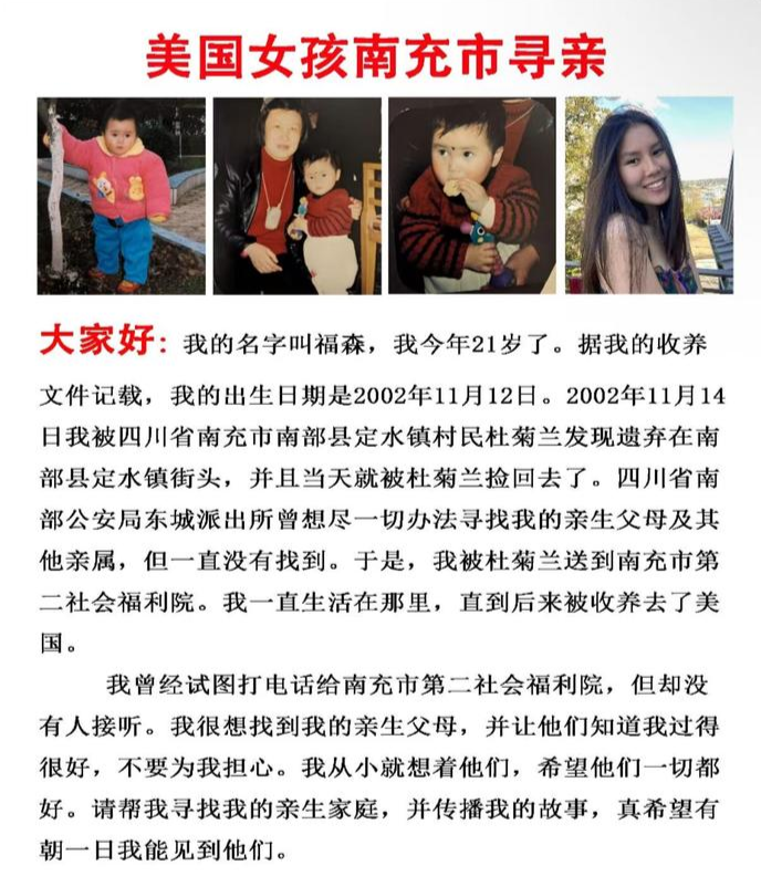 志愿者联系上贝拉本人。“她一直知道自己是领养的孩子,收养她的美国家庭对她很好。现在长大了,希望能有机会找到中国亲人,美国的家人也很支持她。”