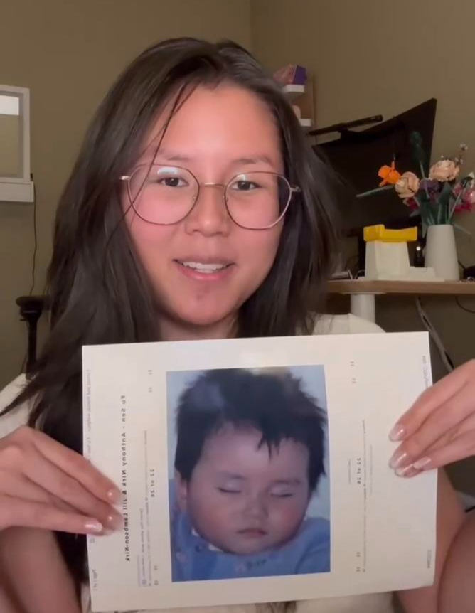视频中贝拉出示自己婴儿时期照片。(视频截图)